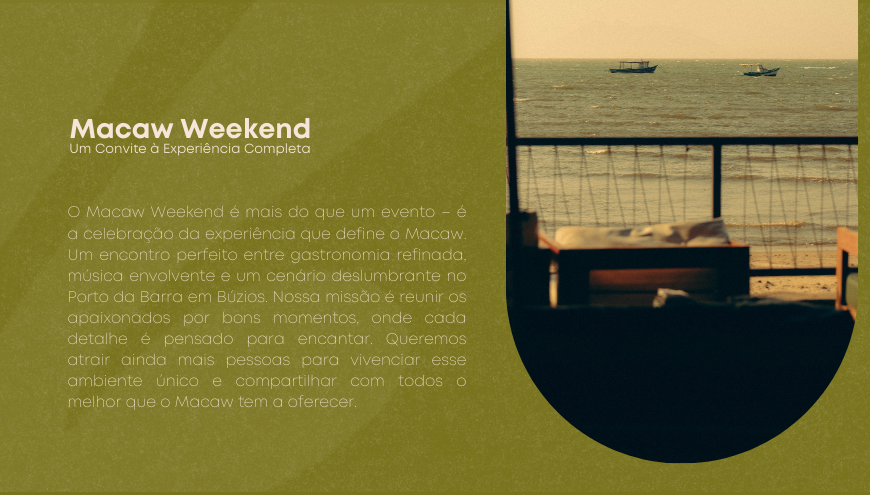 O Macaw Weekend foi um projeto que nasceu para ser mais que um evento: ele deveria ser a expressão viva da marca Macaw, combinando lifestyle, gastronomia e música em um cenário único.